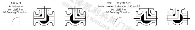電動低溫三通球閥分L型和T型,介質流通方向見下圖。L型電動三通球閥適用于介質流向的切換,能使相互垂直的兩個通道連通:T型電動三通球閥適用于介質的分流、合流或流向 切換,T型孔道可以使三個通道互相連通或使其中兩個通道連通,電動三通球閥一般采用三個閥座結構,亦可根據用戶要求采用四閥座結構。